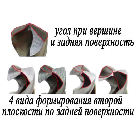 Вторую плоскость на задней поверхности, при необходимости, можно сформировать четырех видов и размеров, что дает большую избирательность в зависимости от материала для сверления.